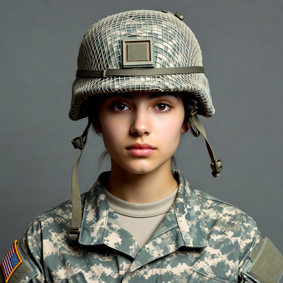 A young woman with dark hair and expressive brown eyes wears a green camouflage helmet and matching military uniform. She stands against a plain gray background with a serious expression. The uniform features a U.S. flag patch on the shoulder.
