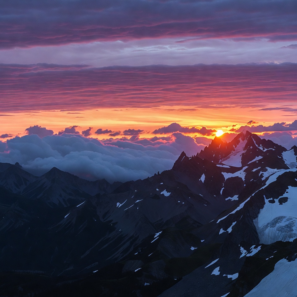 alpine landscape, clouds, dramatic sky, glowing sun, horizon, layered clouds, mountain range, mountains, nature, orange sun, peak, pink clouds, purple sky, ridges, scenery, sky, snow, snowy peaks, summit, valleys, vibrant colors, sunset