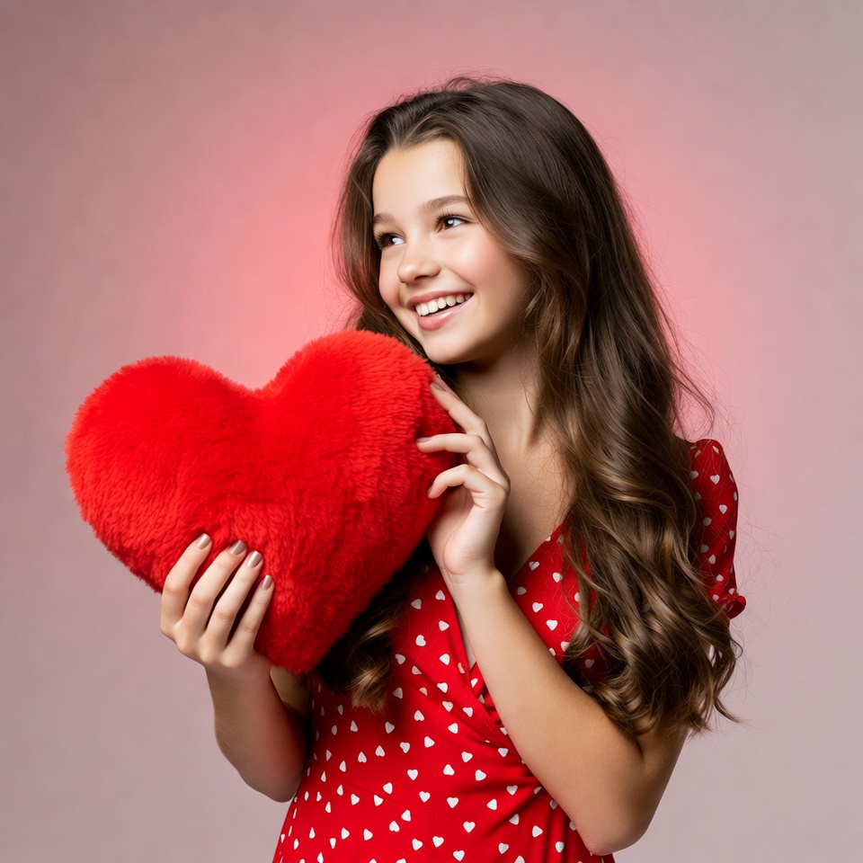 A young girl with long brown wavy hair smiles happily while holding a large fluffy red heart-shaped pillow. She wears a red polka dot dress with white hearts and stands against a pink background. Her eyes are bright and she gently grips the soft pillow with both hands.