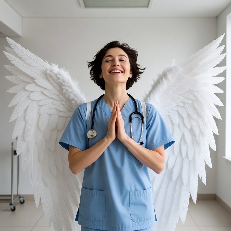 White, angel wings, angelic nurse, blue uniform, feathers, female, hands clasped, happy nurse, healthcare worker, hospital room, indoor, joyful, medical, prayer gesture, praying, scrubs, smiling, stethoscope, white wings, wings, woman, nurse