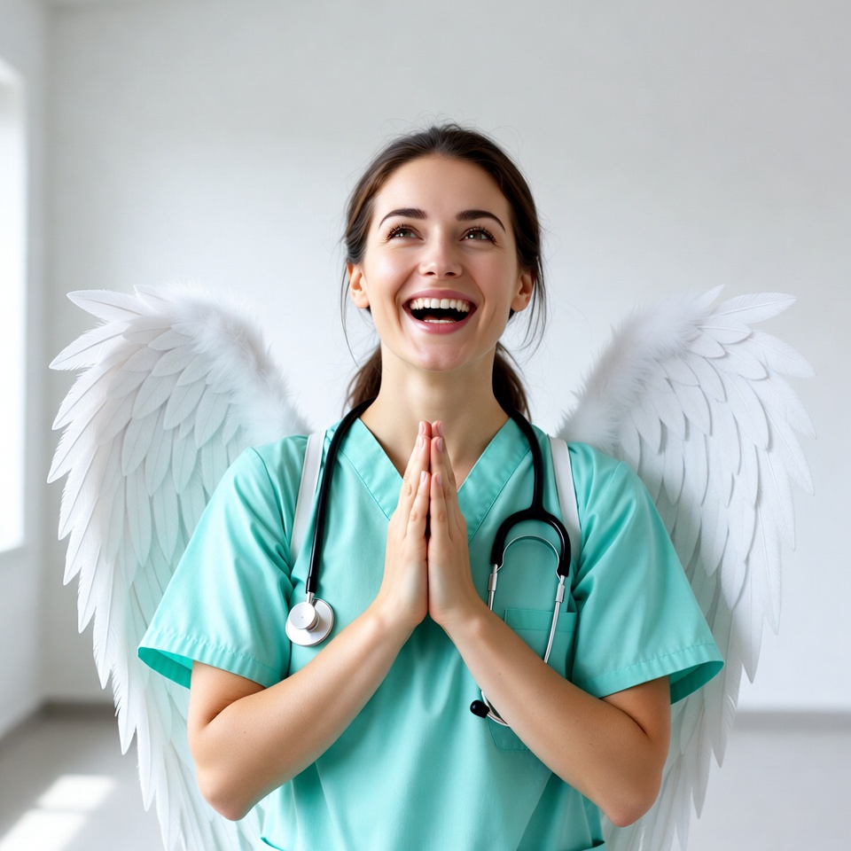 White, angel wings, angelic nurse, brown hair, female, hands clasped, healthcare worker, hospital room, indoor, joyful, medical uniform, ponytail, praying, smiling, stethoscope, teal scrubs, white background, white wings, woman, nurse
