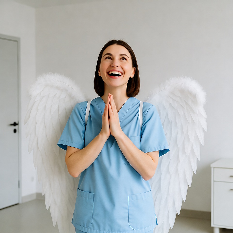 A smiling woman with shoulder-length brown hair wears a blue nurse uniform and large white feathered angel wings. She stands in a white room with hands clasped in prayer and looks upward joyfully. A door and cabinet are visible in the background.