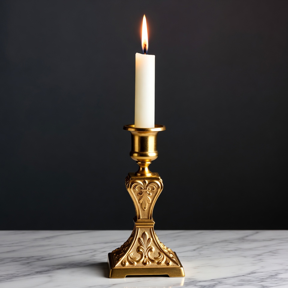 A white candle with a bright flame sits in an ornate gold candlestick on a marble surface. The candlestick features intricate floral engravings and a dark background highlights its glow. The flame flickers steadily atop the smooth wax.