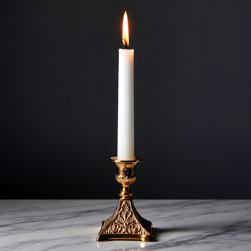 A tall white candle with a bright flame sits in an ornate gold candlestick on a marble surface. The candlestick features intricate engravings and a dark background highlights the warm glow of the flame. The setup is isolated against the black backdrop.