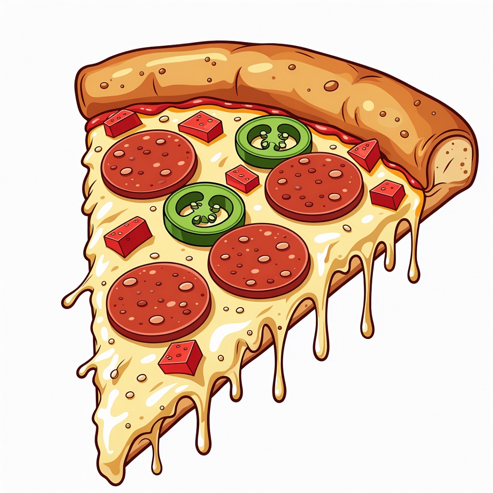 cartoon pizza, cheese pizza, clipart, dripping cheese, food clipart, food illustration, golden crust, green jalapenos, illustration, isolated background, jalapeno peppers, pepperoni pizza, pepperoni slices, pizza art, pizza toppings, red tomatoes, slice of pizza, tasty pizza, vector pizza, pizza slice