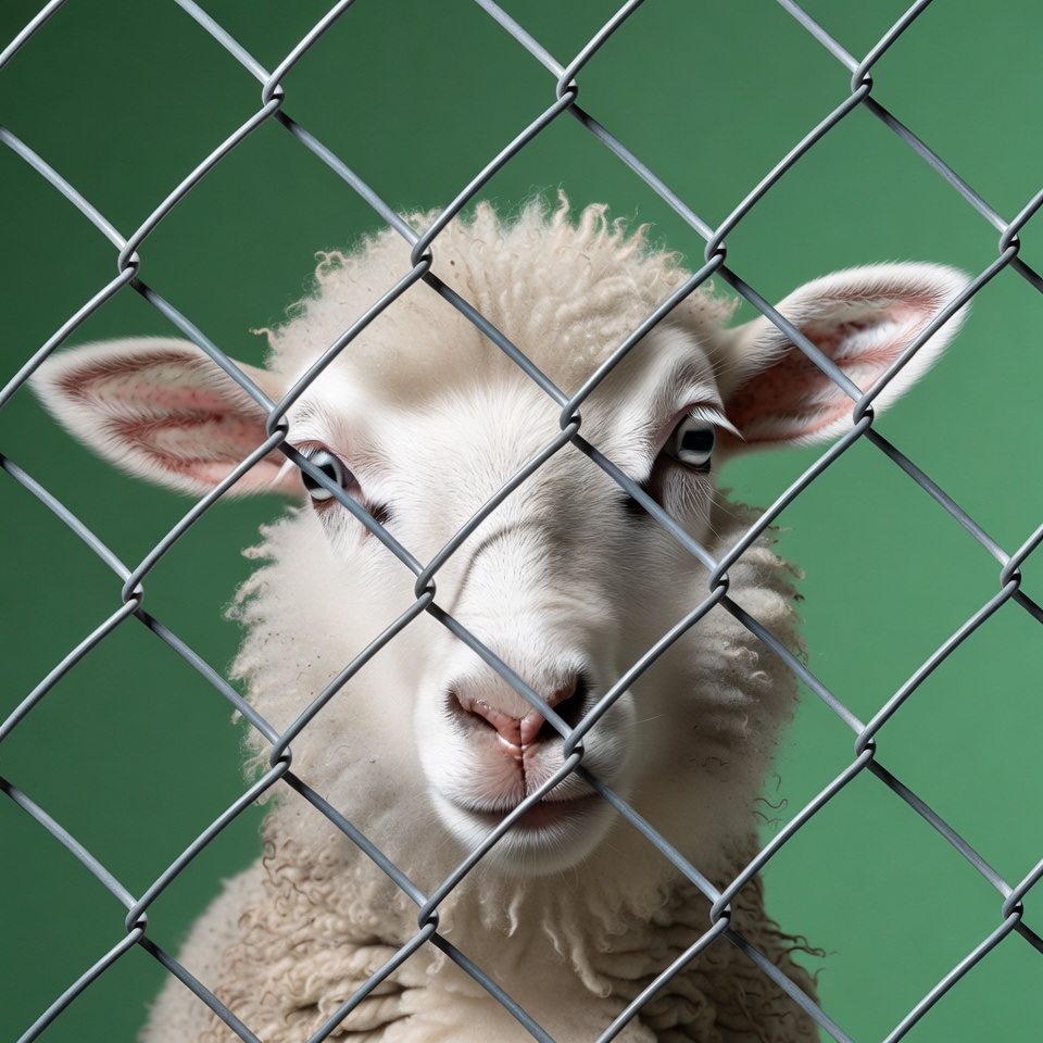 animal face, chain link fence, farm animal, fluffy sheep, green background, isolated background, livestock, peering through fence, sheep eyes, sheep nose, white sheep, wire fence, woolly sheep, sheep