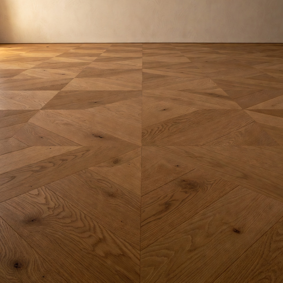 A close-up view of a polished hardwood floor features intricate parquet patterns in warm oak tones. The geometric diamond and chevron designs create a symmetrical layout across the spacious room. Soft natural light illuminates the empty floor against a plain beige wall.