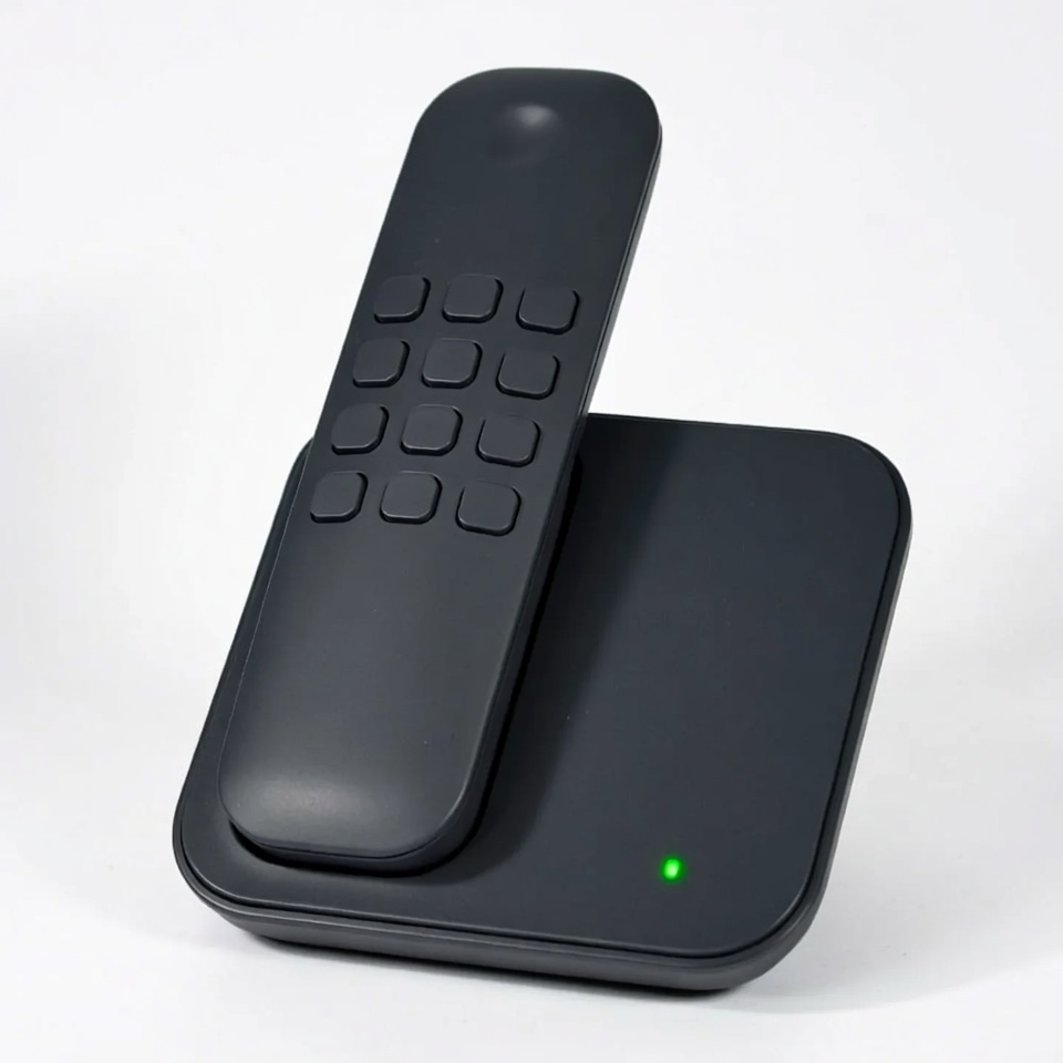 black phone, charging base, desk phone, green light, home phone, isolated background, modern phone, numeric keypad, office phone, phone handset, telephone, wireless phone, cordless phone