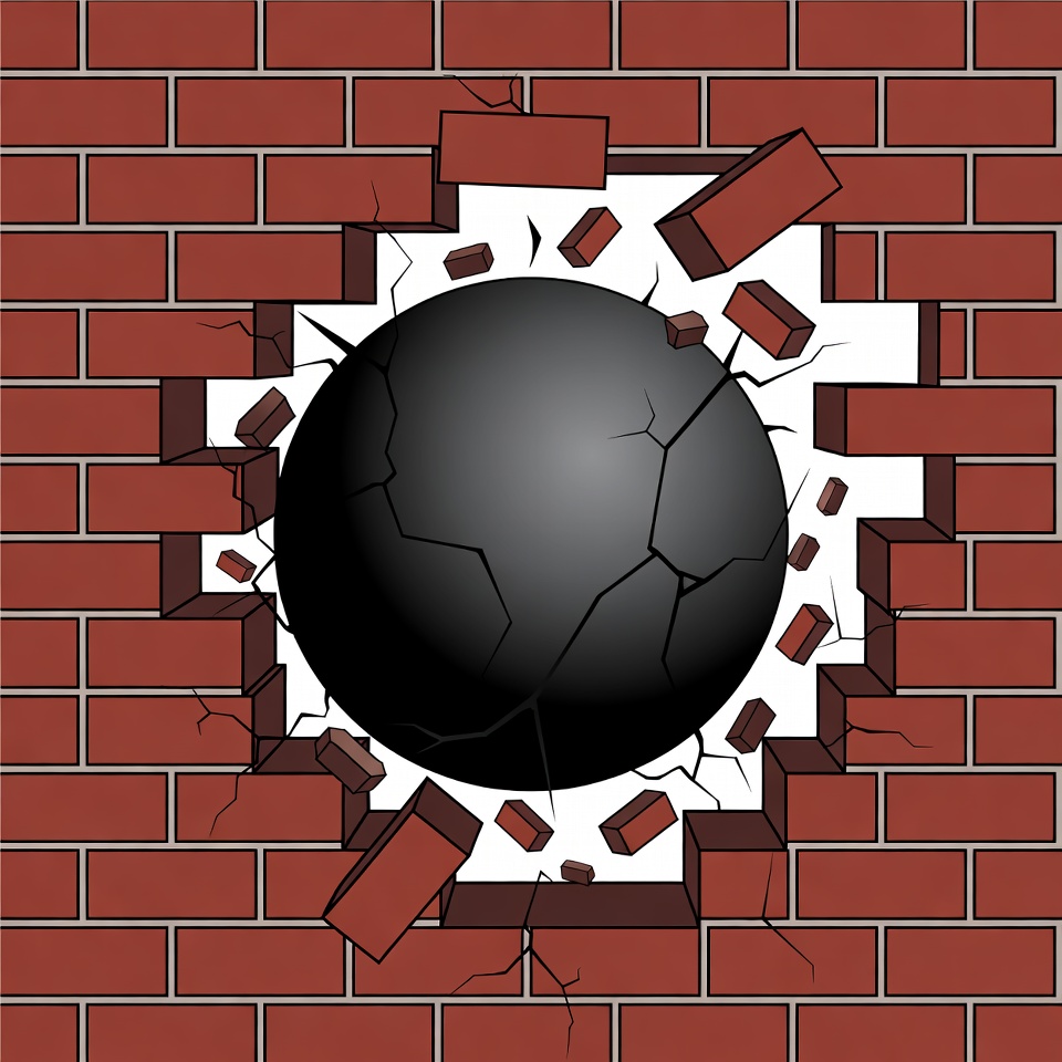 A cartoon illustration depicts a solid black ball smashing through a red brick wall, creating a large hole with jagged edges and scattered brick debris. The wall features a prominent circular breach where the ball protrudes. Flying brick fragments surround the impact area on an isolated white background.