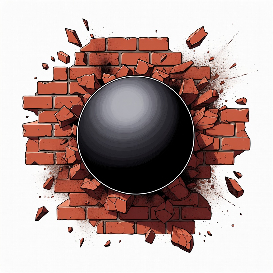 A cartoon illustration depicts a red brick wall with a large circular hole smashed through it by a dark cannonball. Flying debris and broken bricks scatter around the impact site. The image is isolated on a white background.