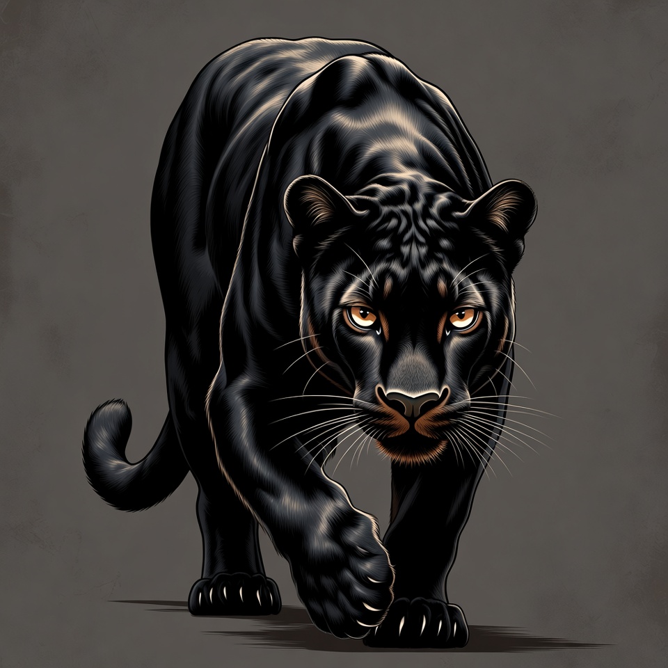 A detailed digital illustration of a sleek black panther walking forward on a dark gradient background. The panther has glossy black fur, intense yellow eyes, and a muscular build with paws extended. Its tail curves behind as it moves stealthily.