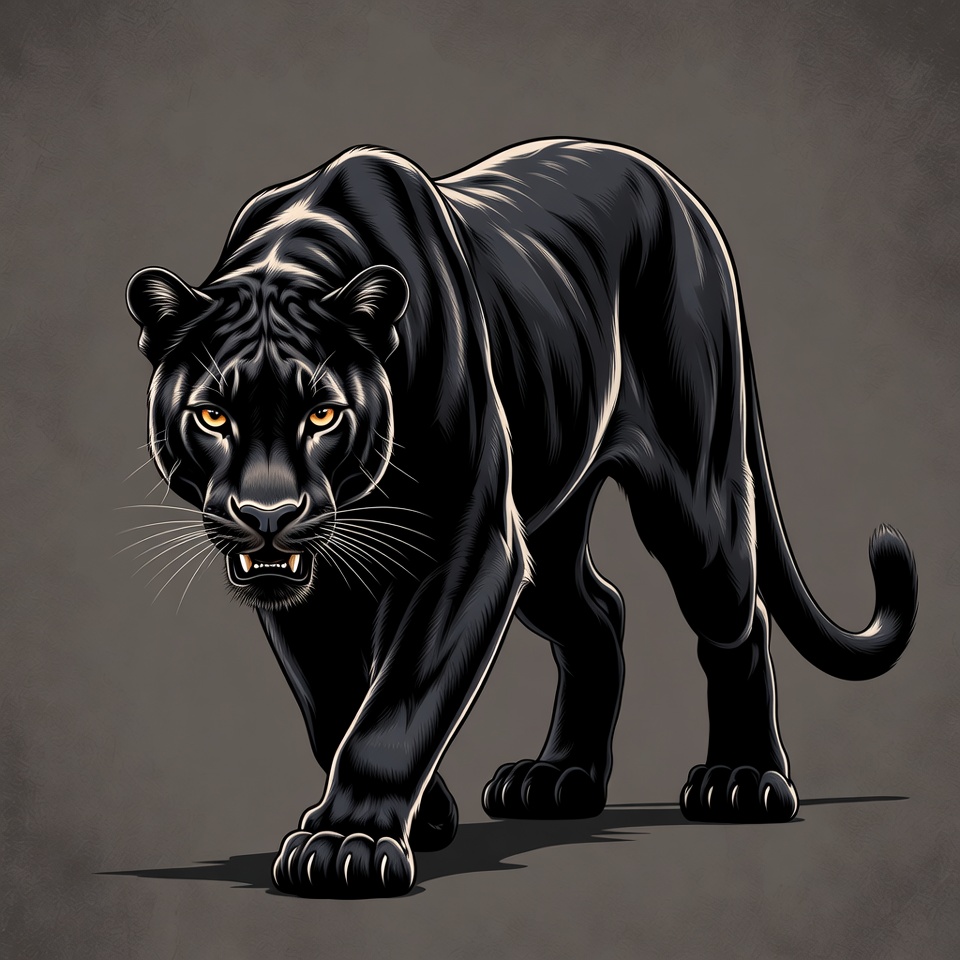 A detailed illustration of a black panther in a prowling stance with yellow eyes and bared fangs. The panther has glossy black fur with white highlights and a curled tail. It stands against a dark gray background with subtle shadows.
