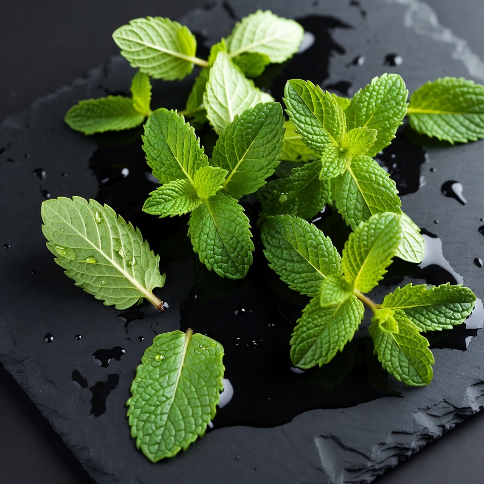 Fresh green mint leaves with water droplets are arranged on a black slate surface. The leaves feature serrated edges and vibrant color against the dark glossy background. Scattered water splashes enhance the fresh appearance.