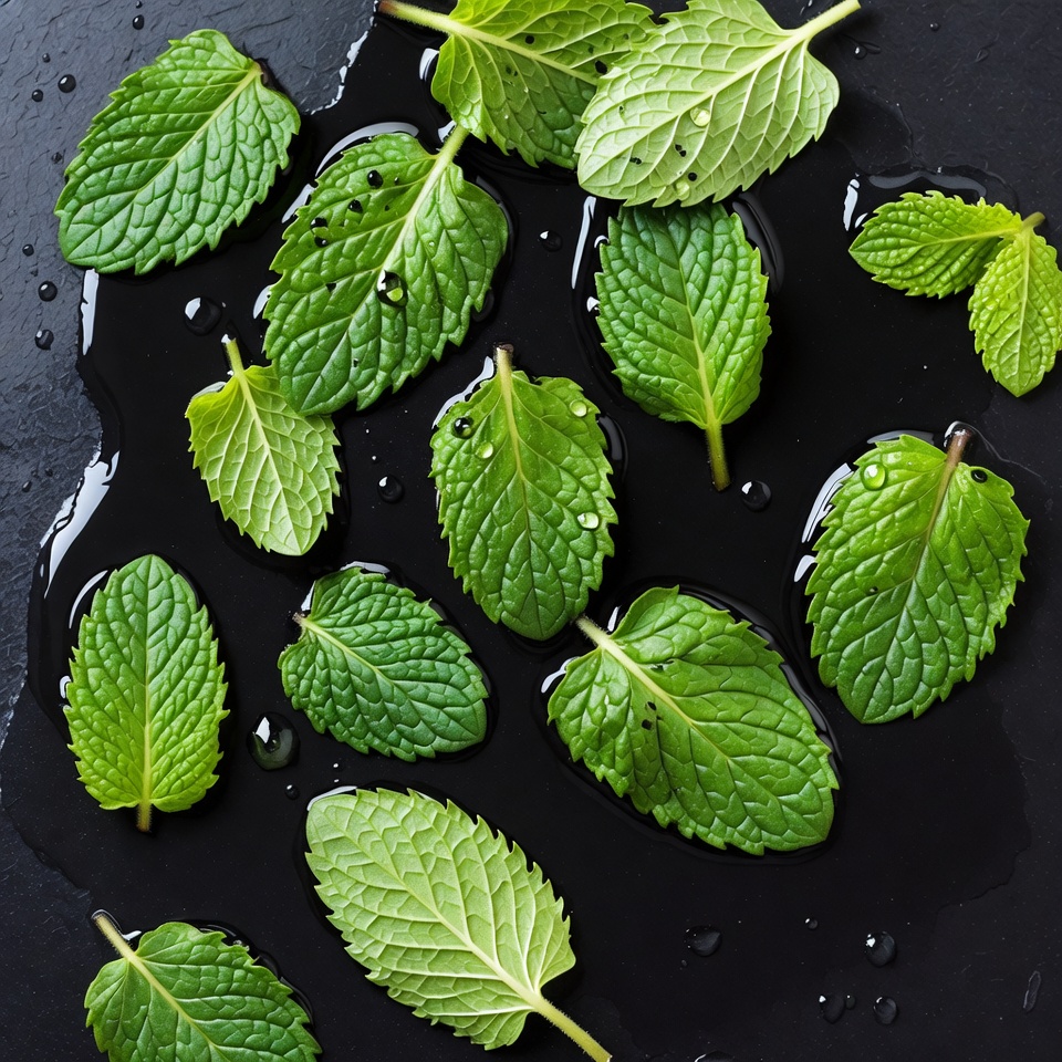 Fresh green mint leaves are scattered across a black slate surface. Water droplets and spills glisten on the leaves and background. The vibrant leaves feature detailed serrated edges.