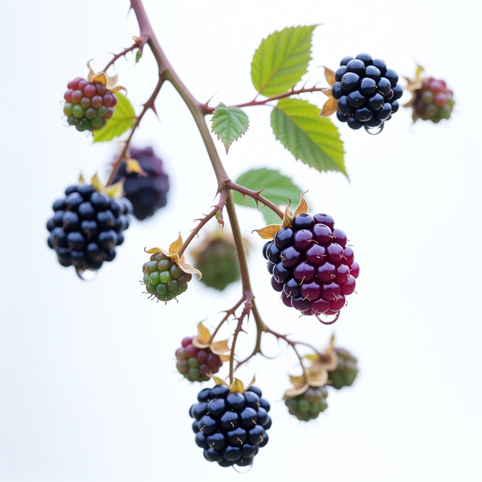 A cluster of ripe blackberries hangs from a thorny branch with green leaves. The berries vary from dark purple to red, some still unripe and green. The image is isolated against a white background.