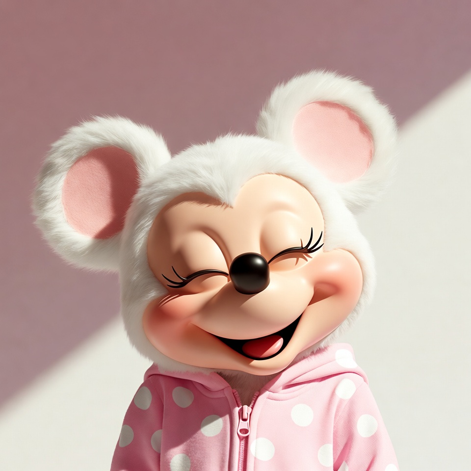 3D render, Disney, Disney character, Mickey Mouse friend, anthropomorphic mouse, black nose, cartoon mouse, closed eyes, cute animal, fuzzy fur, happy expression, illustration, isolated background, pink hoodie, polka dots, smiling mouse, white ears, Minnie Mouse