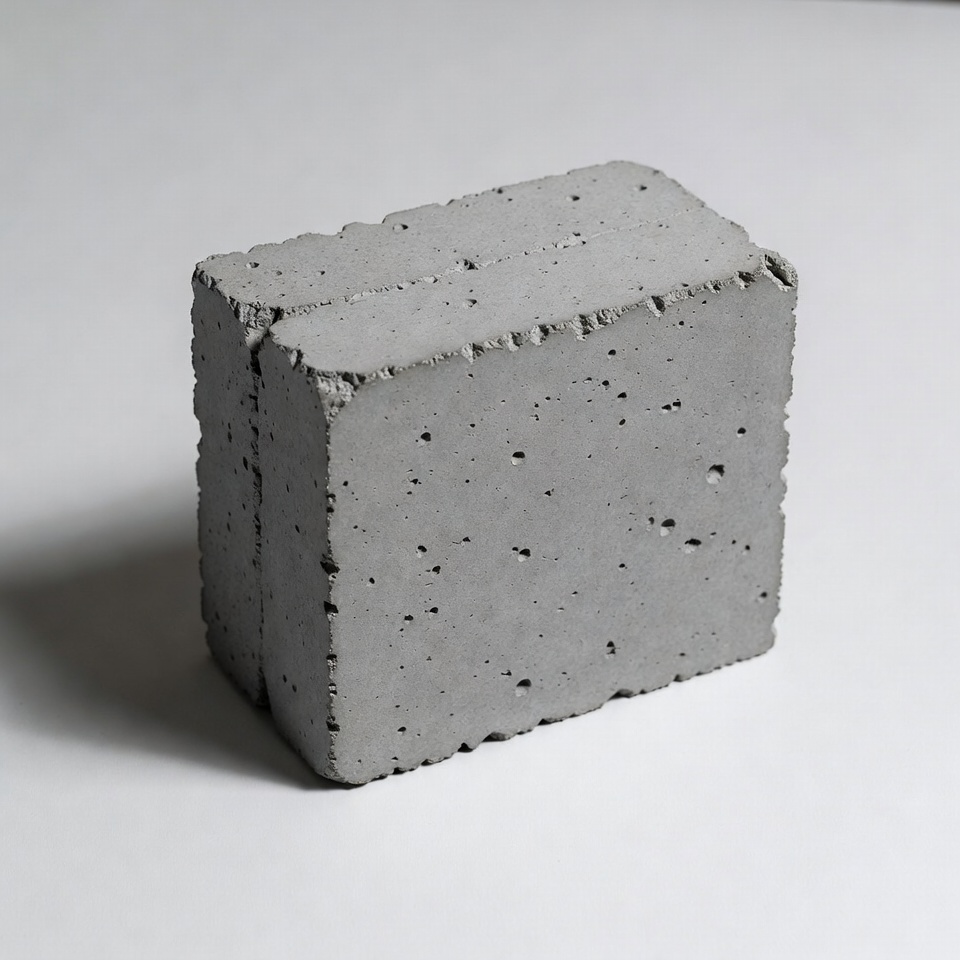 A rectangular gray concrete block with textured, porous surfaces sits on a white background. The block features rough edges and small air pockets typical of concrete material. It is photographed from a straight-on angle, emphasizing its cubic shape.