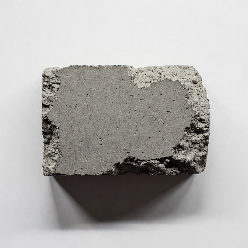 A rectangular concrete block with a rough, textured surface sits on a plain white background. The block features uneven edges and a gray cement appearance with visible aggregate. It is photographed from a top-down angle, casting a subtle shadow.