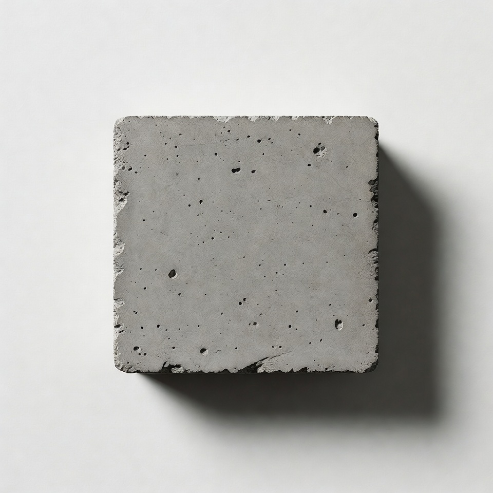 A square gray concrete block sits centered on a plain white background. The textured surface shows small air pockets and rough aggregate. It is viewed from above with a subtle drop shadow.