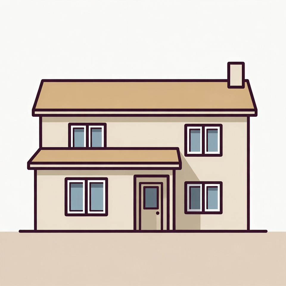 A simple line drawing illustration of a two-story beige house with a brown roof and chimney. It features multiple rectangular windows, a front door, and a small porch overhang. The house is centered on a plain white background.