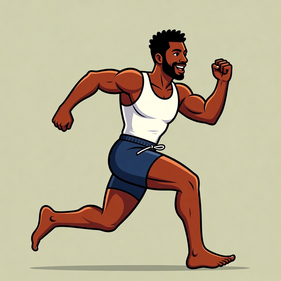 African-American man, Black athlete, arm pump, athletic build, bare feet, blue shorts, cartoon man, clipart, curly hair, dynamic run, exercise, fitness, illustration, isolated background, male runner, muscular man, powerful physique, running pose, smiling runner, sprinting, strong legs, tank top, white tank, running man