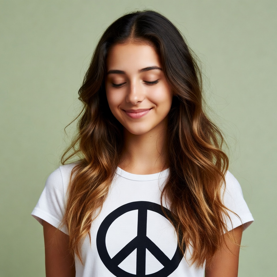 A young woman with long wavy brown hair smiles softly at the camera. She wears a white t-shirt featuring a large black peace symbol on a green background. Her eyes are slightly closed in a serene expression.