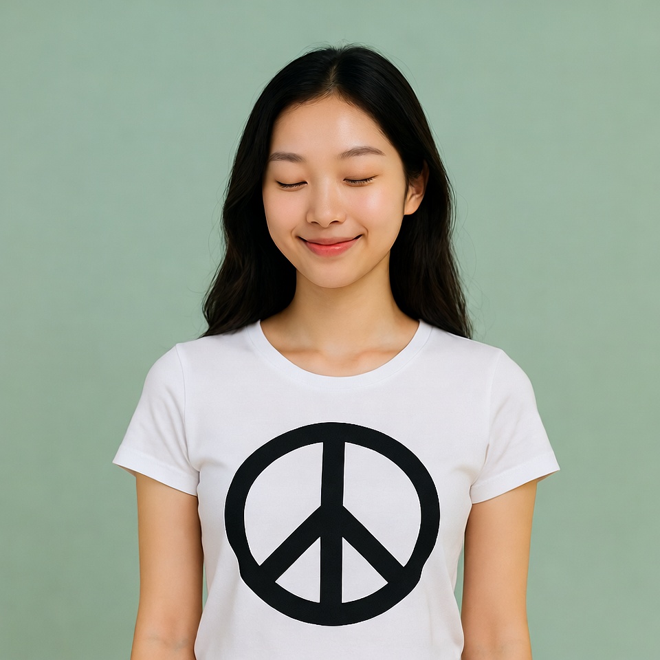 A young Asian woman with long black hair stands against a light green background, wearing a white short-sleeved t-shirt featuring a large black peace symbol. She has her eyes closed, a gentle smile on her face, and her hands clasped in front of her. Her expression appears calm and serene.