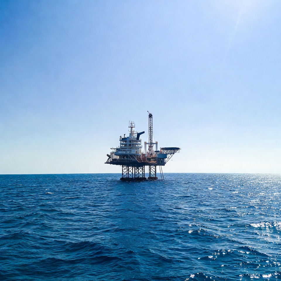 A large offshore oil platform stands in the middle of a calm blue ocean under a clear sky. The white and blue rig features cranes, decks, and tall structures. Sunlight reflects off the water surrounding the isolated platform.