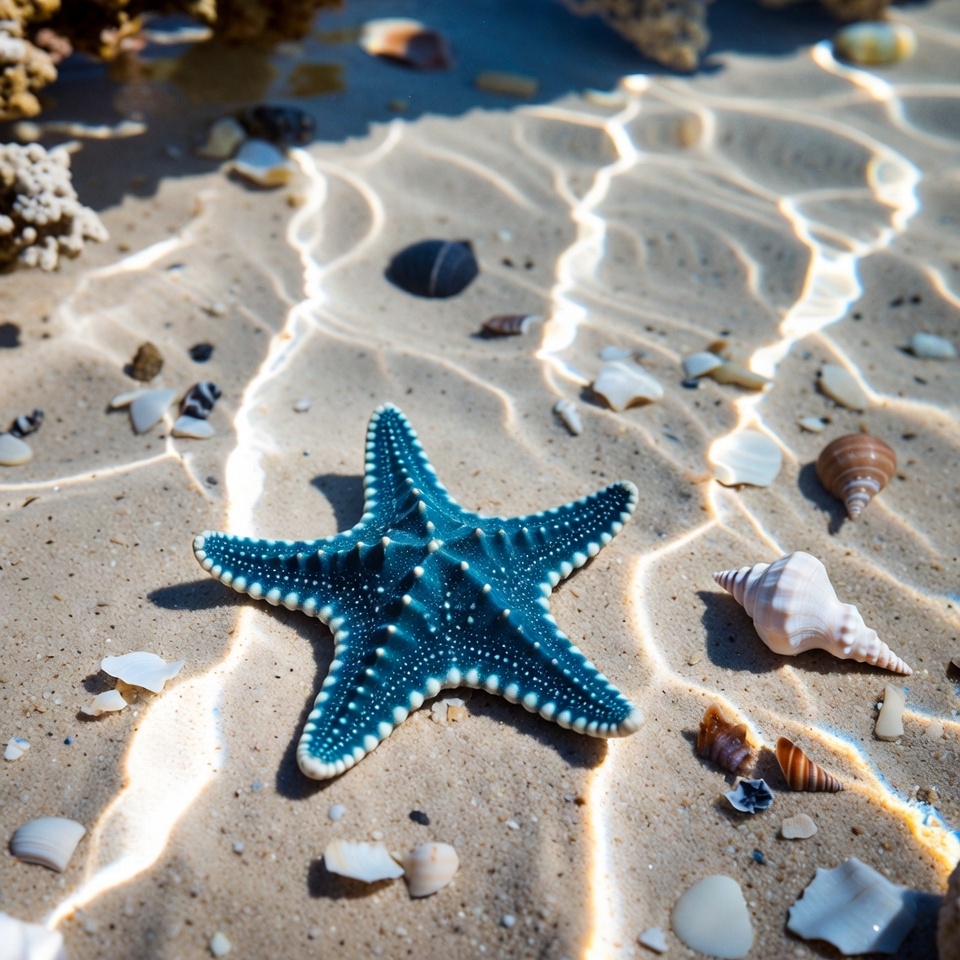 A vibrant blue starfish with white-spotted arms rests on a shallow sandy ocean bottom. Colorful corals, seashells, and small rocks surround it amidst clear rippling water. Sunlight filters through, highlighting the marine details.