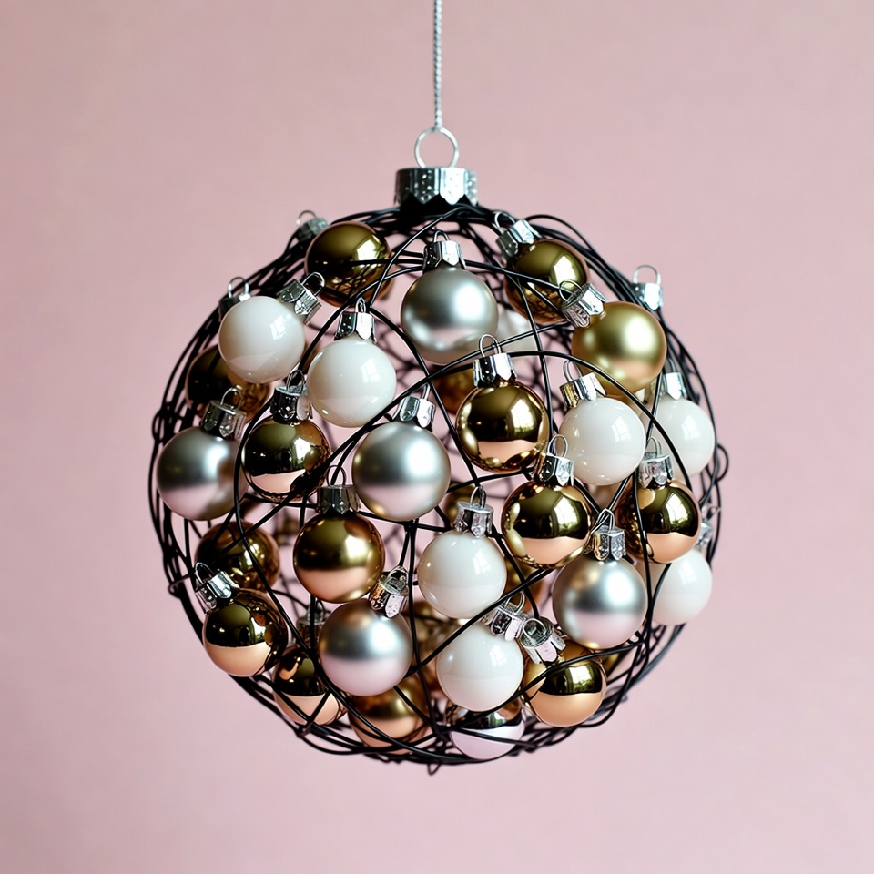 A large spherical wire frame ornament is filled with numerous hanging Christmas baubles in gold, silver, and white colors. It is suspended by a thin chain against a soft pink background. The baubles vary in size and shine with metallic finishes.