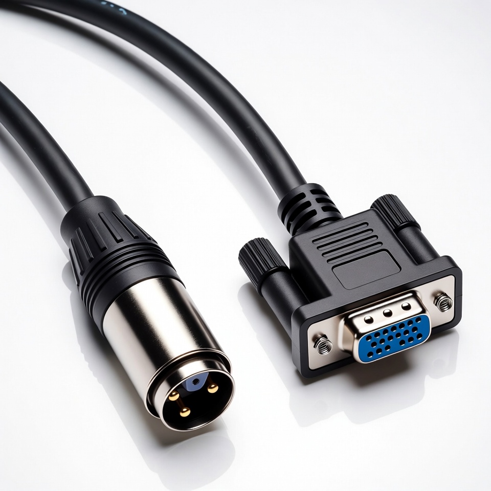 VGA cable, VGA connector, VGA male, XLR connector, XLR male, audio cable, audio video, black cable, blue connector, cable adapter, conversion cable, equipment cable, male connector, pin connector, professional cable, tech cable, thumbscrew, video cable, white background, XLR cable