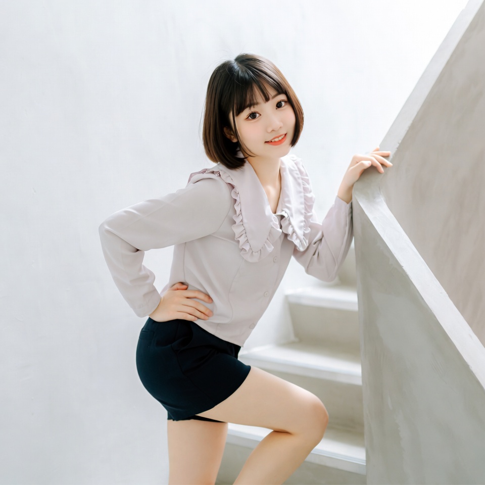 A young Asian woman with straight black bob haircut smiles while posing on white stairs. She wears a light pink frilled collar blouse, black shorts, and places one hand on the stair railing with the other on her hip. Her legs are visible as she stands sideways against the minimalist white background.