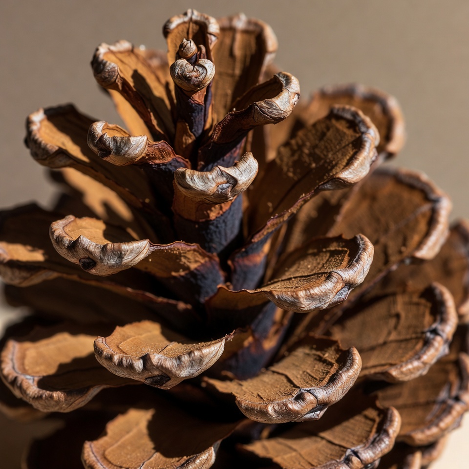 A detailed close-up view of a single pine cone with brown scales and white edges. The cone is centered against a light beige background, showcasing its textured surface and layered structure. Subtle shadows highlight the natural contours and ridges.