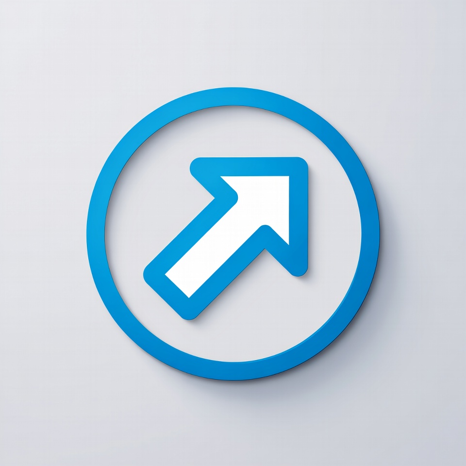 A white upward arrow is enclosed within a bold blue circle on a light gray background. The design features a 3D effect with smooth shading. It is isolated and simple.