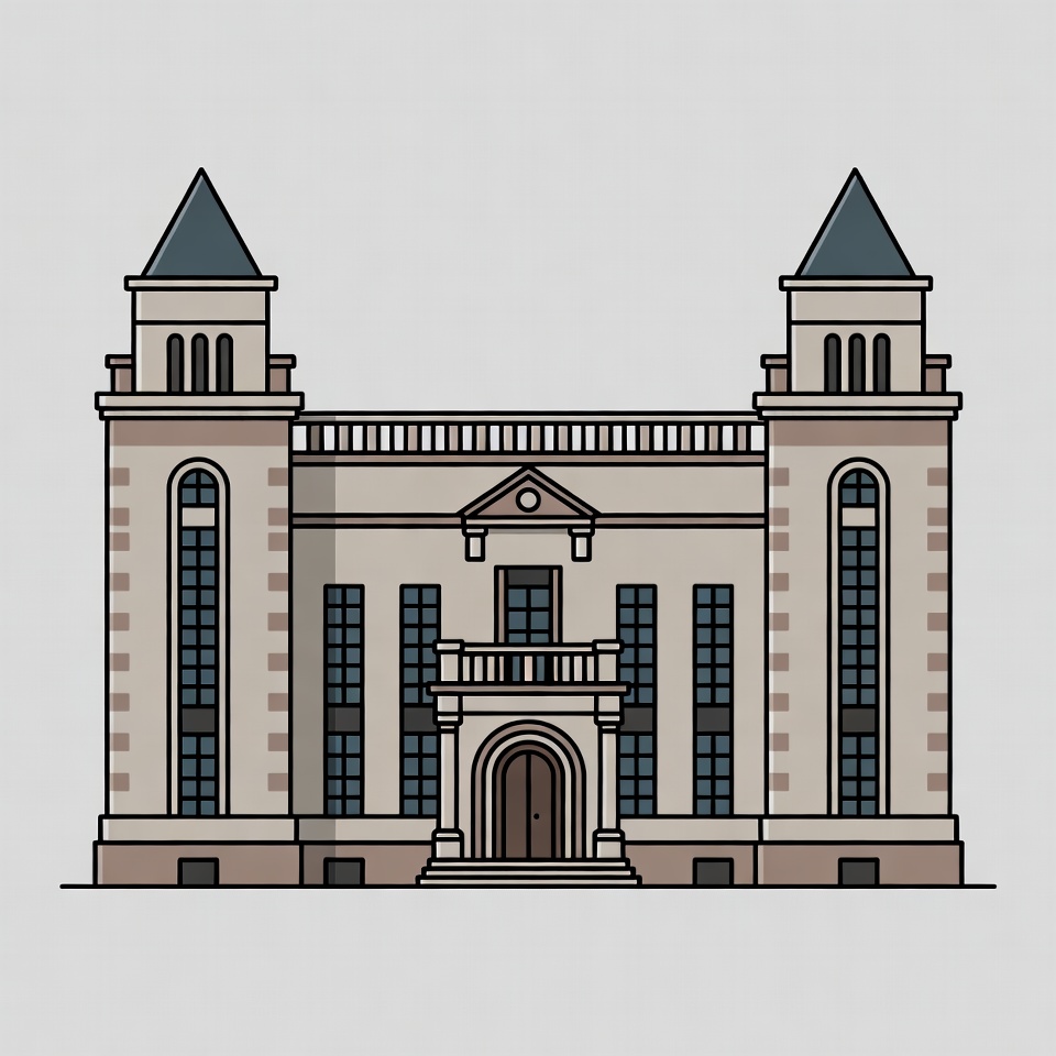 A minimalist line drawing of a grand mansion features two tall towers with conical roofs. The building has tall arched windows, a central pediment, balcony, and arched entrance door. It stands on a plain gray background.