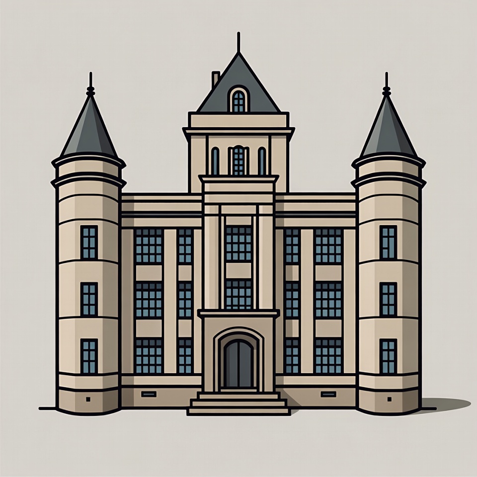 A detailed line art illustration of a grand chateau-style building with four conical towers and multiple windows. The structure features a central arched entrance and symmetrical design on an isolated light gray background. The beige-toned architecture includes dormer windows and a prominent steeple.