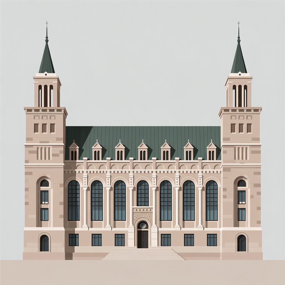 A detailed vector illustration of a grand Gothic-style cathedral with two tall spires topped by green roofs. The beige stone facade features multiple arched windows, ornate decorations, and a central entrance with steps. The building is centered on a plain gray background.