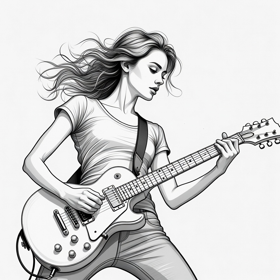 White, black and white, blonde hair, detailed drawing, dynamic pose, electric guitar, female, flowing hair, guitar strap, guitarist, illustration, instrument, jeans, line art, long hair, music, performance, playing guitar, rock musician, white t-shirt, young woman, woman