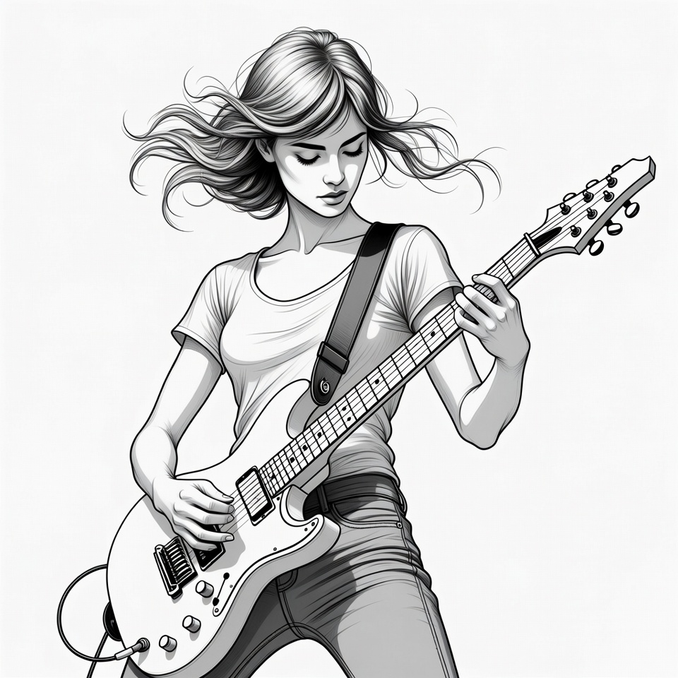 White, black and white, blonde hair, dynamic pose, electric guitar, female, flowing hair, guitar strap, illustration, jeans, line art, musical instrument, playing guitar, rock musician, white t-shirt, young woman, woman