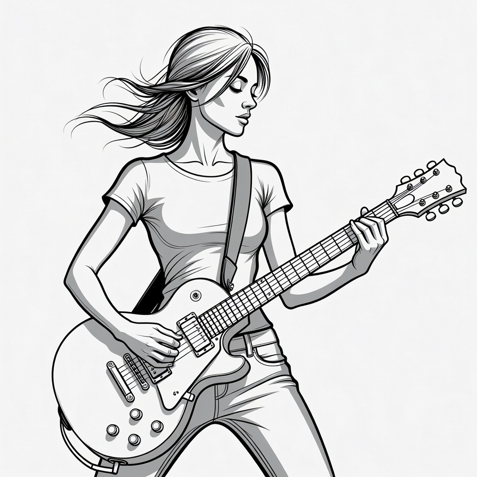 White, black and white, blonde hair, dynamic pose, electric guitar, female, flowing hair, guitar strap, illustration, isolated background, jeans, line art, long hair, musical instrument, performing, playing guitar, profile view, rock musician, rocker, sketch, t-shirt, vector art, woman