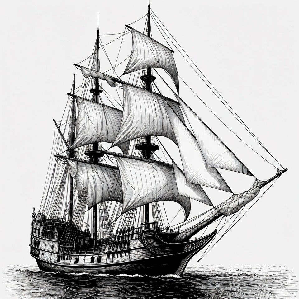 A detailed black and white illustration of a classic tall sailing ship with multiple masts and billowing sails. The ship glides on calm ocean waves, featuring intricate rigging and wooden hull details. It is depicted in a vintage engraving style on an isolated background.