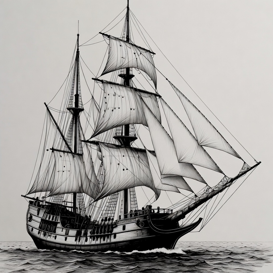 A detailed black and white ink drawing depicts a large three-masted sailing ship with billowing sails navigating on the ocean. The ship features intricate rigging, multiple decks, and wooden hull details. Gentle waves surround the vessel under a clear sky.