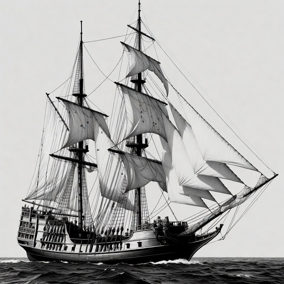 A detailed black and white illustration of a large sailing ship with multiple masts and billowing sails navigates through ocean waves. The ship features intricate rigging and several small figures on deck. It sails against a vast sea under a clear sky.