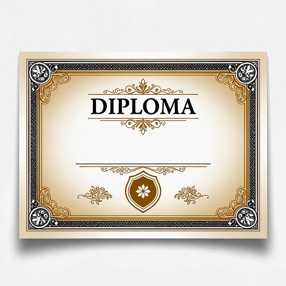 achievement, award, beige background, black accents, blank template, certificate, certificate template, education, floral design, formal document, gold frame, graduation, illustration, ornate border, shield emblem, vector, diploma