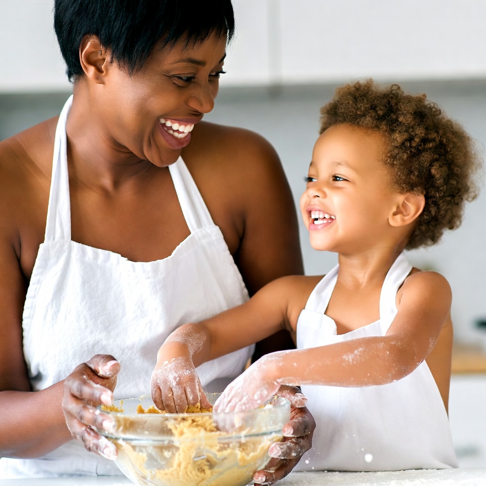 A smiling African-American mother with short black hair wears a white apron while holding a glass bowl of cookie dough in a modern kitchen. Her young daughter with curly afro hair, also wearing a white apron, stands on a stool reaching into the bowl with flour-covered hands. Flour dusts the white countertop around them.