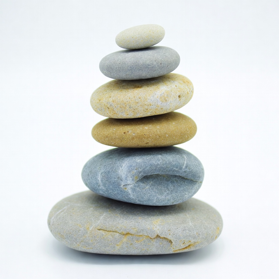 A tall stack of six smooth pebbles balances precariously on a white background. The pebbles vary in size and color, from light gray and beige to darker blue-gray tones. They are arranged in a precise vertical tower.