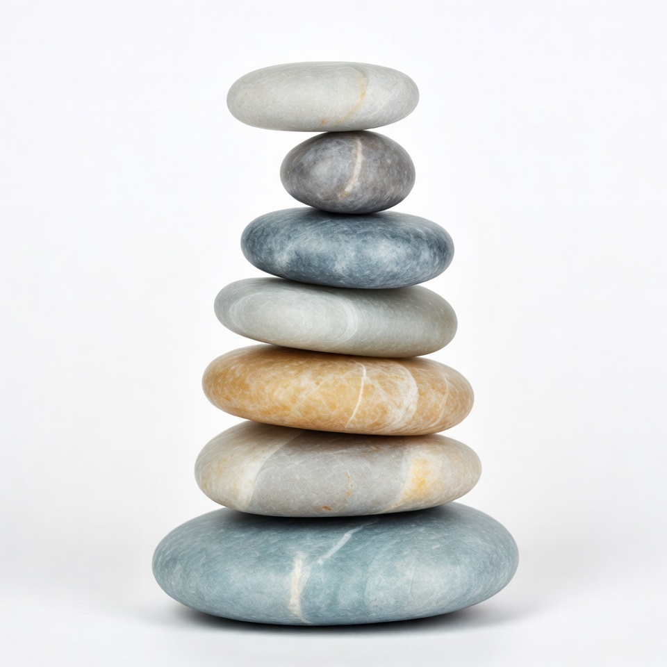 A tall stack of smooth pebbles in shades of gray, blue, and beige stands balanced on a white surface. The stones are rounded and vary slightly in size, forming a precarious tower. The isolated background emphasizes the zen-like arrangement.