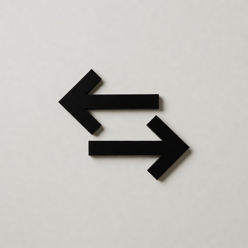 Two black wooden arrows, one pointing left and one pointing right, are placed side by side on a plain white background. The arrows have a minimalist design with clean edges and a slight shadow effect.