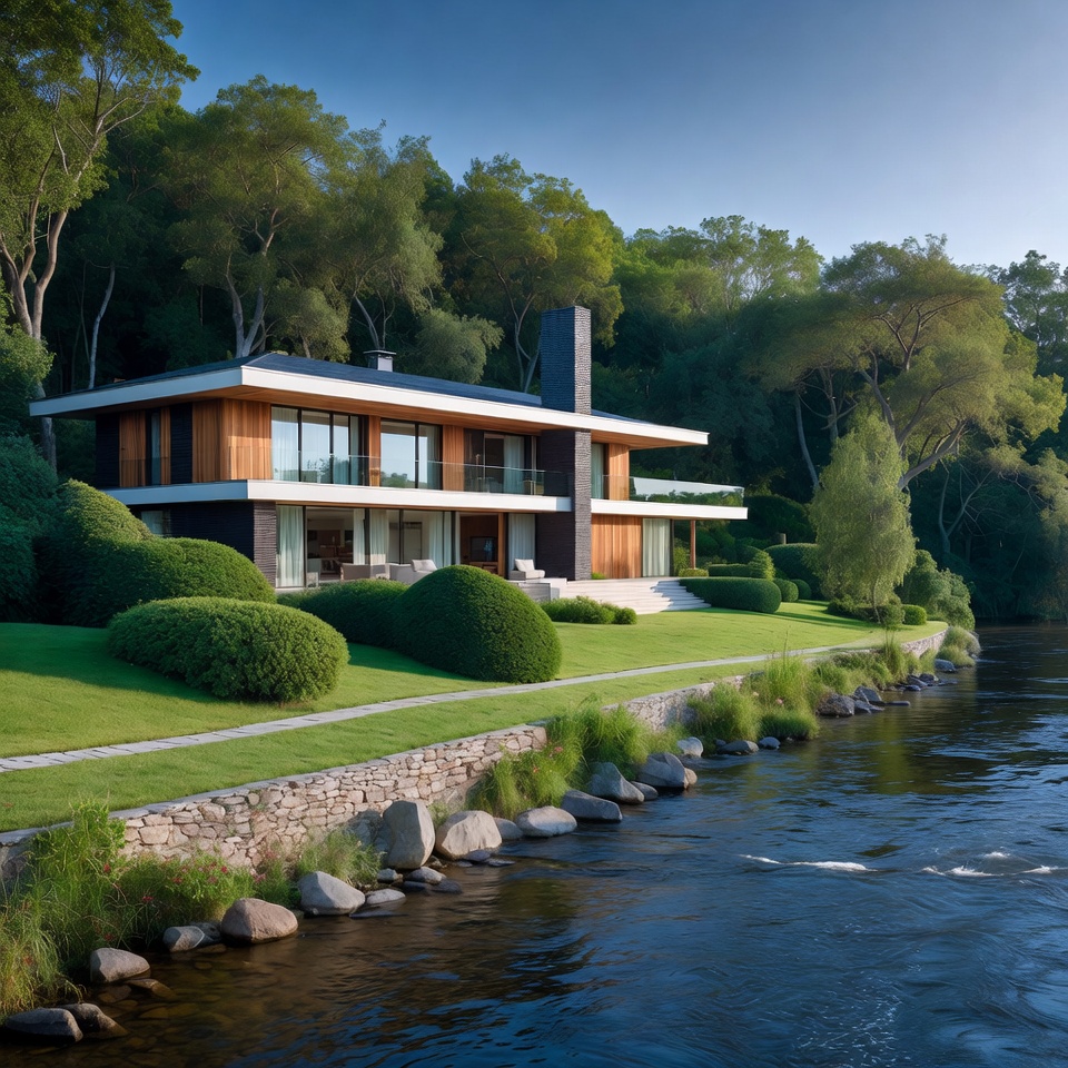 A sleek modern house with white and wood cladding sits on a grassy hill surrounded by dense green trees. It features large glass windows, a prominent black chimney, and landscaped bushes. The house overlooks a calm river with stone walls and a stone pathway along the waterfront.