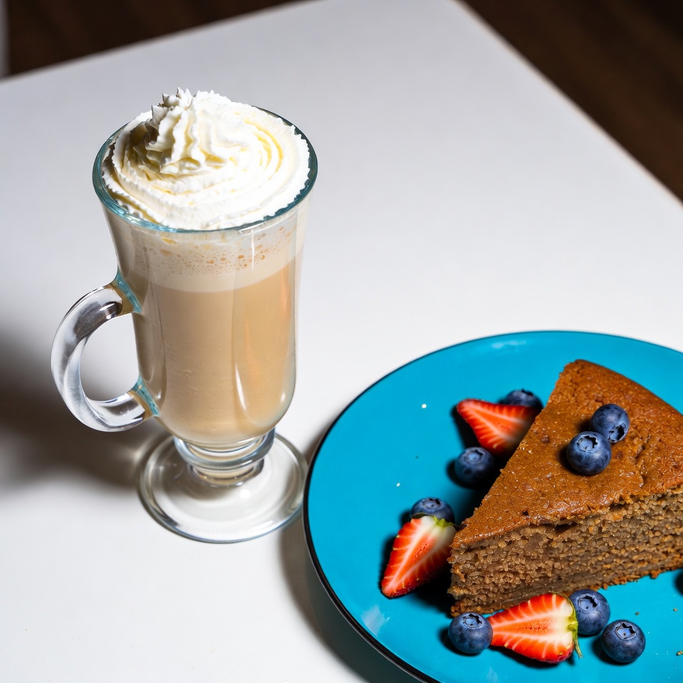 Latte with Whipped Cream and Blueberry Cake